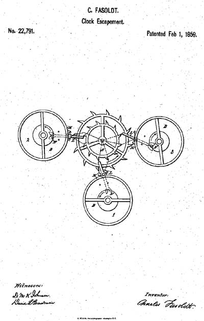 | Fasoldt- Hemmung | 1.2.1859 | Charles Fasoldt (1818-1898) | Patent US22791; |