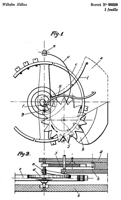 | Hilken- Hemmung | 9.7.1920 | Wilhelm Hilken | Patent CH90338; |