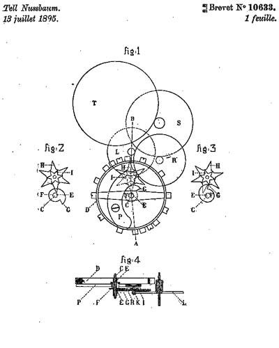 | Nussbaum- Hemmung | 13.7.1895 | Tell Nussbaum | Patent CH10633; |