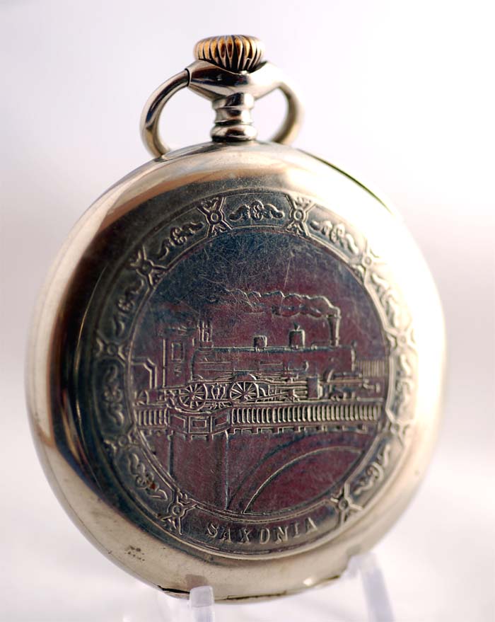 Auf dem Rückdeckel findet sich der Schriftzug "Saxonia". Ausserdem findet sich das Relief einer Lokomotive die eine Brücke überquert. Tatsächlich gab es eine Lokomotive namens "Saxonia". |