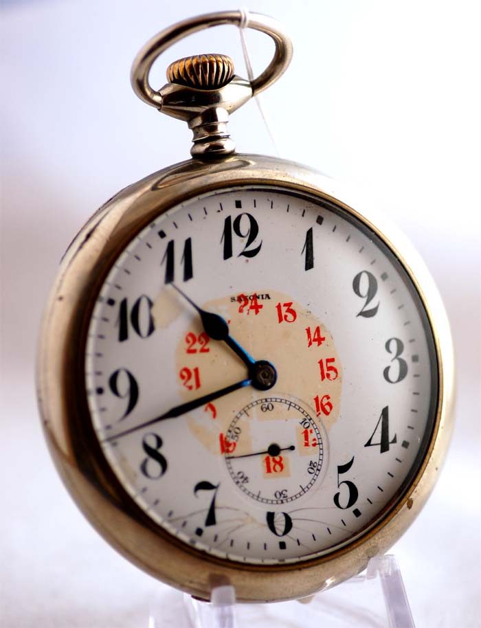 Auf dem Zifferblatt ist der Schriftzug "Saxonia" zu erkennen. |