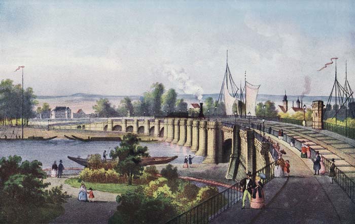 Bei der auf dem Relief dargestellten Brücke scheint es sich um die Marienbrücke in Dresden zu handeln. Tatsächlich gab es zwischen Leipzig und Dresden eine Bahnverbindung bei welcher die Elbe eben mit dieser Brücke überquert wurde. |