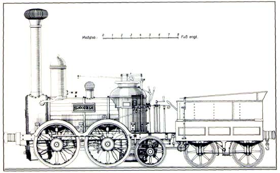 Die "Saxonia" der Leipzig-Dresdner Eisenbahn-Compagnie war die erste funktionstüchtige in Deutschland gebaute Dampflokomotive. Sie war für die Eröffnungsfahrt auf Deutschlands erster Fernbahnstrecke Leipzig - Dresden am 7. April 1839 vorgesehen. Doch auf Anweisung der Behörden wurden hierfür zwei englische Maschinen verwendet. Die "Saxonia" fuhr hinter dem Eröffnungszug her und wurde durch einen Sabotageakt an der Weiterfahrt gehindert. |