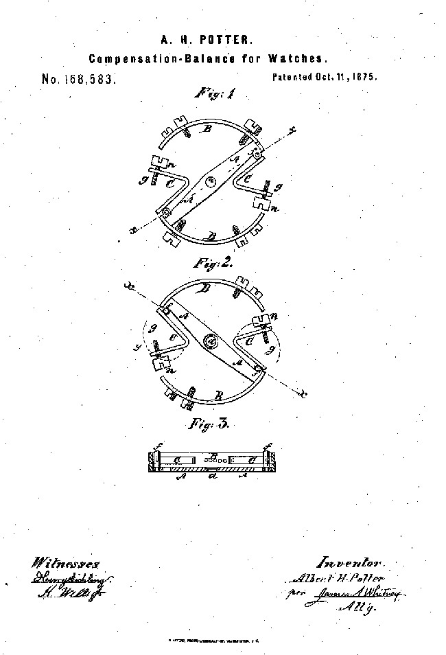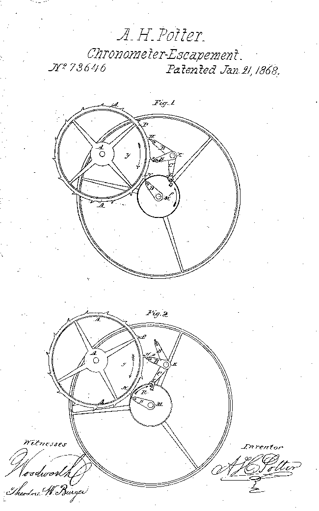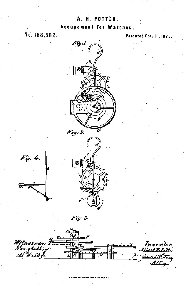 Er wurde am 13.07.1836 in Mechanicville/N.Y. geboren. Er war das zweite von vier Kindern des Müllers und Lehrers William Lawrence Potter und Eliza Van Vranken. In der Zeit von 1852-55 absovierte er die Uhrmacherlehre bei Wood & Foley in Albany/N.Y.. 1955 eröffnete er in New York in der 19 John Street eine Reparaturwerkstatt. Später zog er mit seiner Werkstatt um in die 84 Nassau Street. Dort begann er eigene Uhren zu entwerfen und herzustellen. In dieser Zeit baute er gerade mal 35 Golduhren von aller feinster Qualität. Sie kosteten zwischen US$ 200 und 300 (üblicher Preis für Golduhren US$ 50). Obwohl die Geschäfte in New York gut gingen, begab er sich von 1861-66 nach Havanna auf Kuba und eröffnete dort eine kleine Reparaturwerkstatt. Anschließend kehrte er in die USA nach Willliamsburg zurück und beschäftigte sich mit Hemmungen. Dieses gipfelte in einem Patent einer Chronometerhemmung (21. Januar 1868). |
